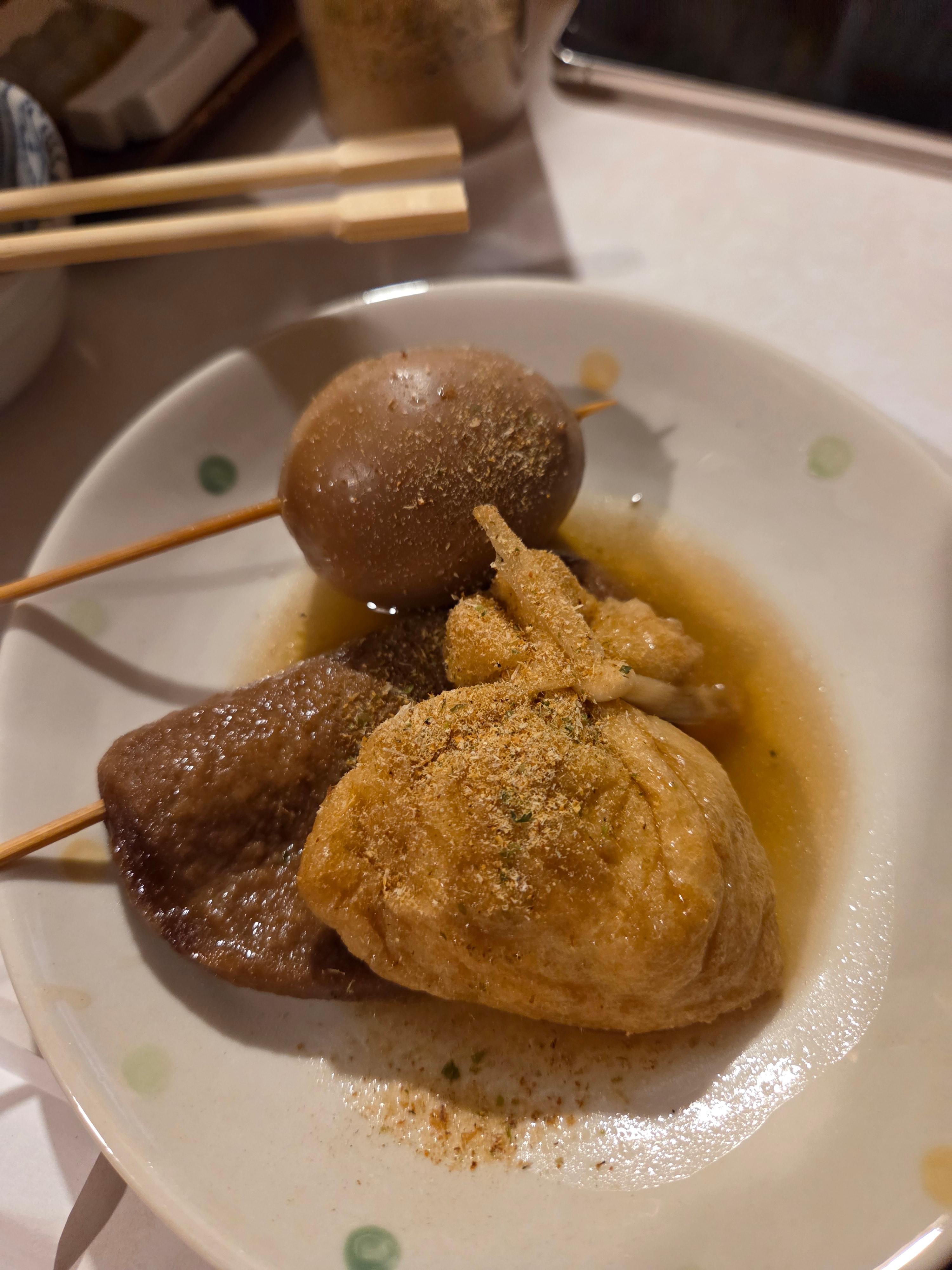 - 마법의 가루 (다시가루 & 파란 김): 오뎅을 건져서 그냥 먹지 않습니다. 테이블 앞에 놓인 가쓰오부시 가루와 파란 김 가루를 듬뿍 뿌려 먹어야 비로소 맛이 완성됩니다.