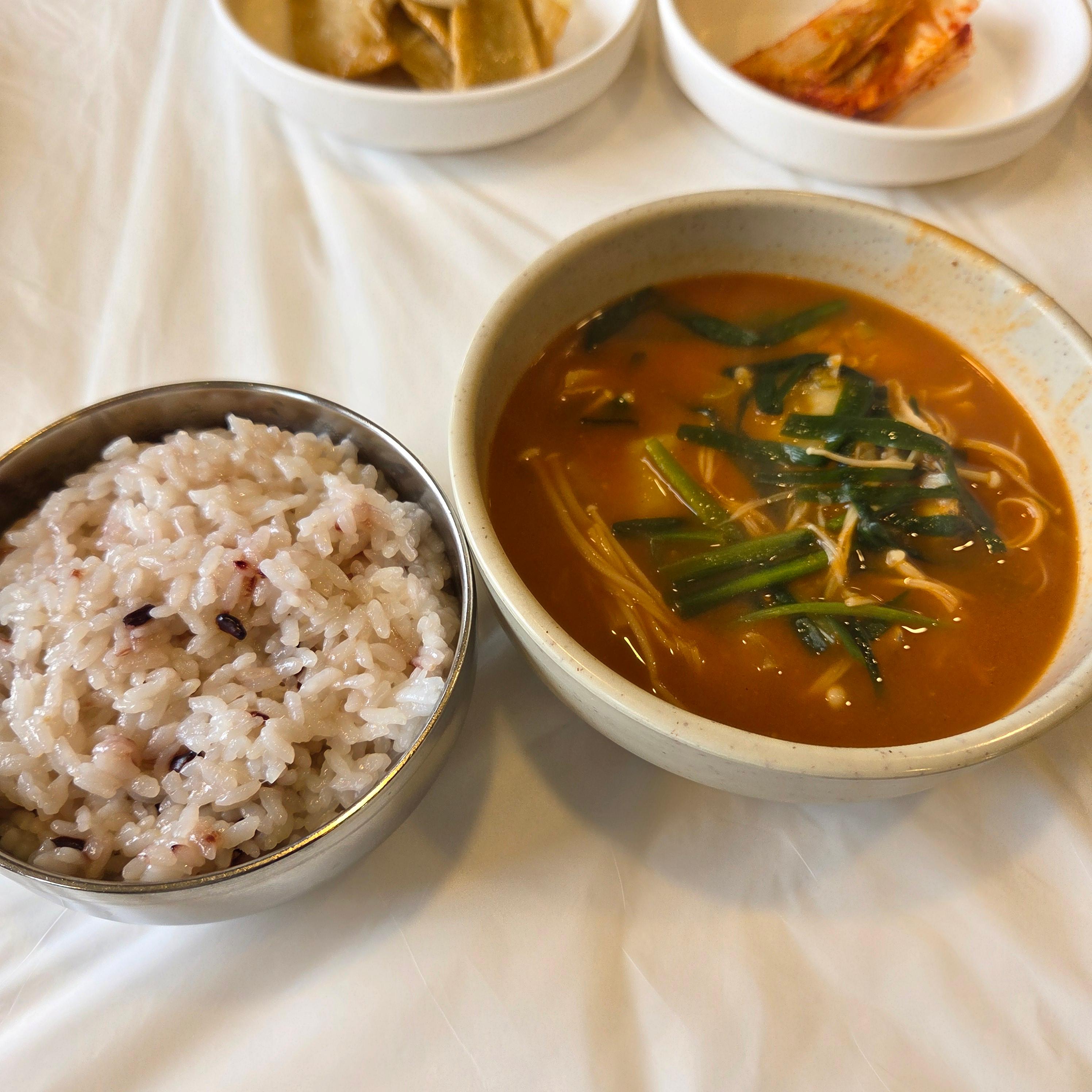 - 장(醬)의 미학: 메뉴판 설명대로 이 국물은 **"장을 풀어 칼칼한 맛"**이 일품입니다. 뽀얀 조개 육수에 고추장과 비법 양념을 풀어내어 텁텁함 없이 시원하고 개운하게 매운맛을 완성했습니다.